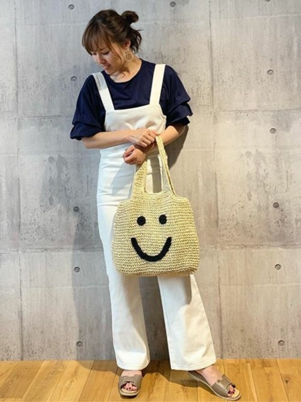 ネイビー×ホワイトで大人カジュアルに♪サロペットは忙しい朝もササっとオシャレが出来てbatamamahappy♪ 袖タックボリュームカットソートップス [C3799] スクエアベルトフラットサンダル [I1836] スマイル刺繍ペーパー素材トートバッグ [B1016] 着用アイテムから飛べない商品&ZOZOTOWNで未販売の商品は、神戸レタスのサイト内で商品ID検索が出来ます♡