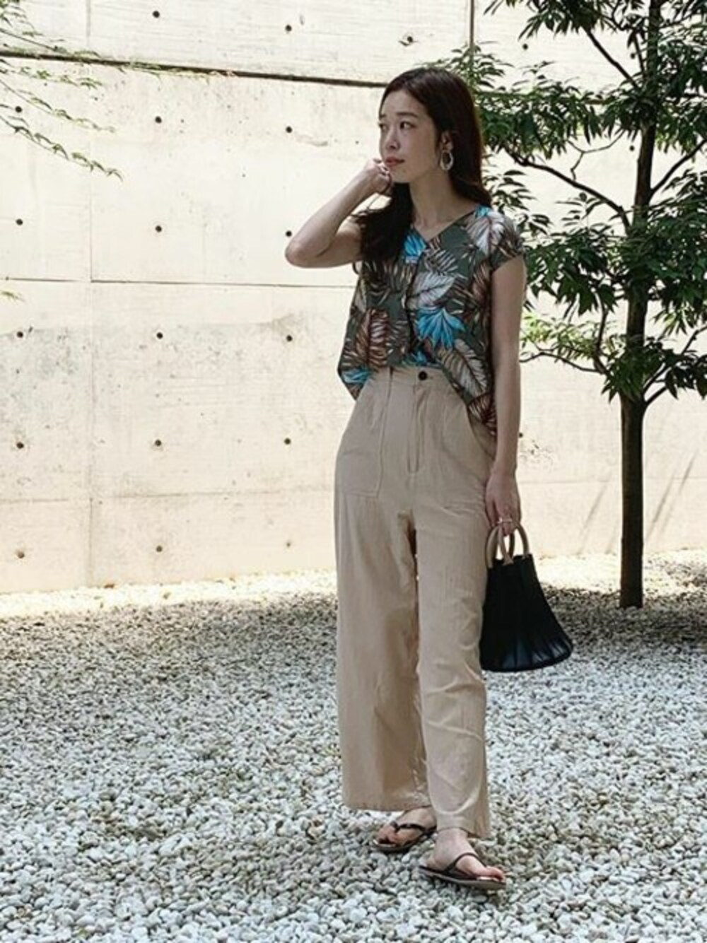 リゾート柄トップスで大人カジュアルな印象に♪ バックねじりノースリトップス [C3915] とろみコットンワイドパンツ [M2469] サークルハンドルプリーツバッグ [B1248] メタリックトゥトングフラットサンダル [I1857] 着用アイテムから飛べない商品&ZOZOTOWNで未販売の商品は、神戸レタスのサイト内で商品ID検索が出来ます♡