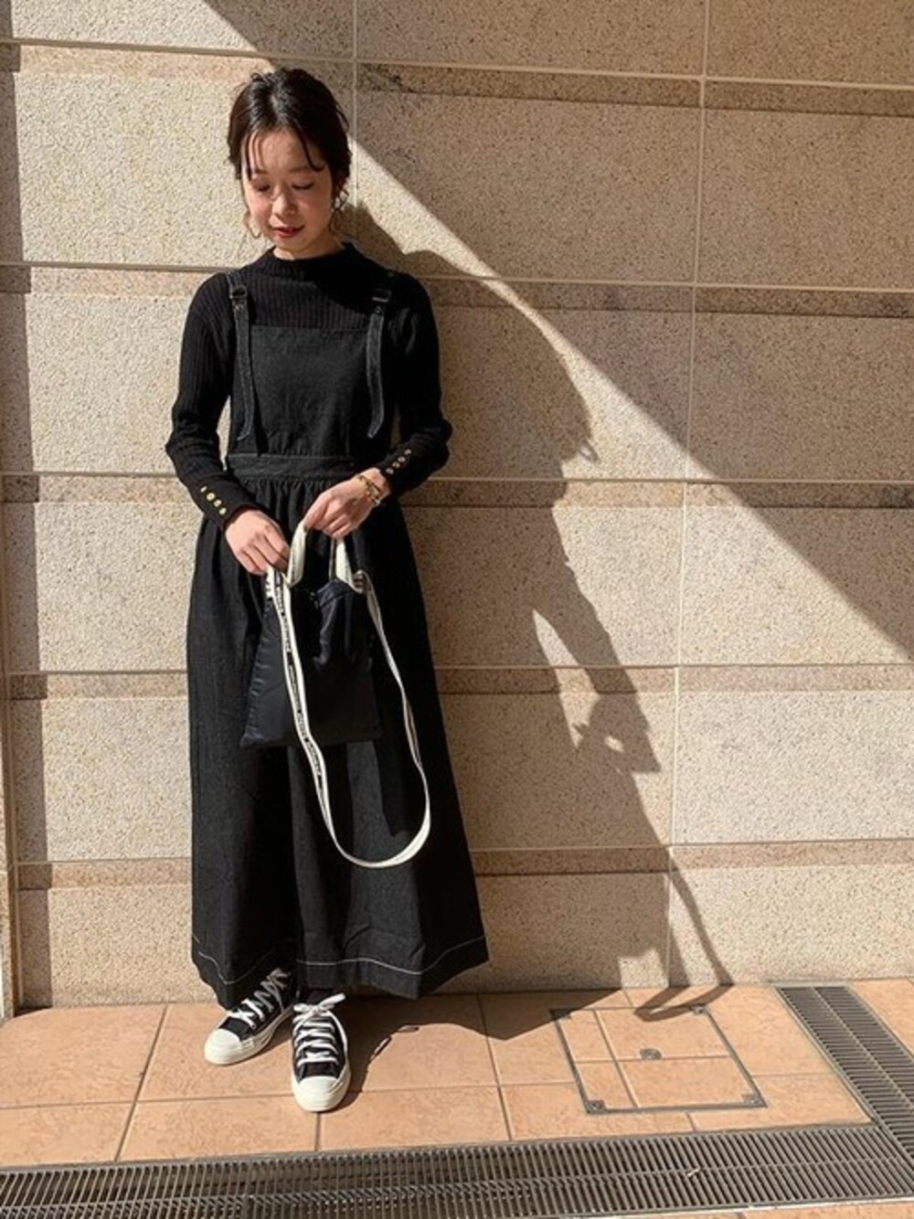 素材違いでまとめたオールブラックコーデ♫ アップヘアでバランスをとるのが◎ デニムギャザージャンスカ [E2335] 袖ボタンボトルネックリブニットトップス [C4322] 着用アイテムから飛べない商品&ZOZOTOWNで未販売の商品は、神戸レタスのサイト内で商品ID検索が出来ます♡