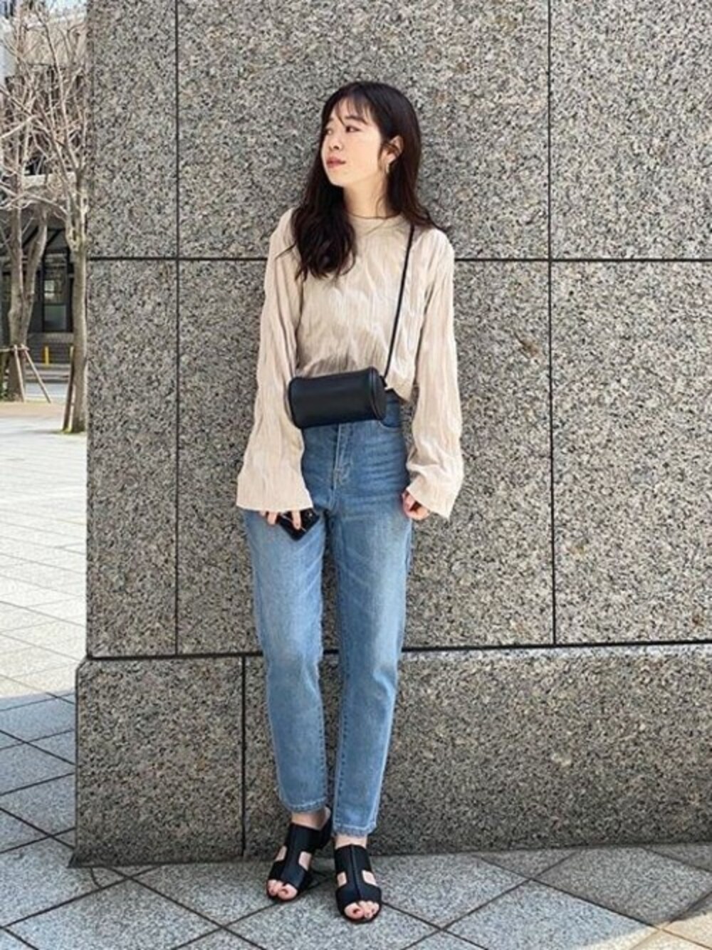 特徴的なクランクルブラウスは、シンプルなデニムでコーデが完成♪ クリンクルブラウス [C4596] ハイライズストレッチデニム [M2753] 筒形ポシェットバッグ [B1337] センターシームサボ [I2103] 着用アイテムから飛べない商品&ZOZOTOWNで未販売の商品は、神戸レタスのサイト内で商品ID検索が出来ます♡