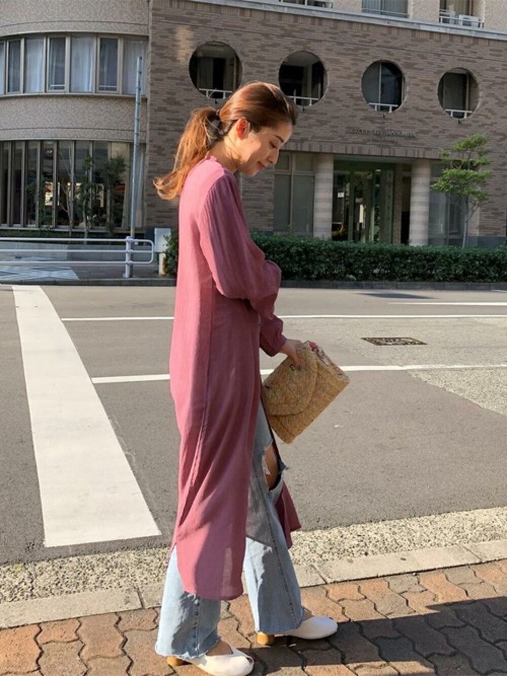 神戸レタス(KOBE LETTUCE本部)のシャツワンピース「タック袖楊柳シアーロングシャツ」を使ったコーディネート