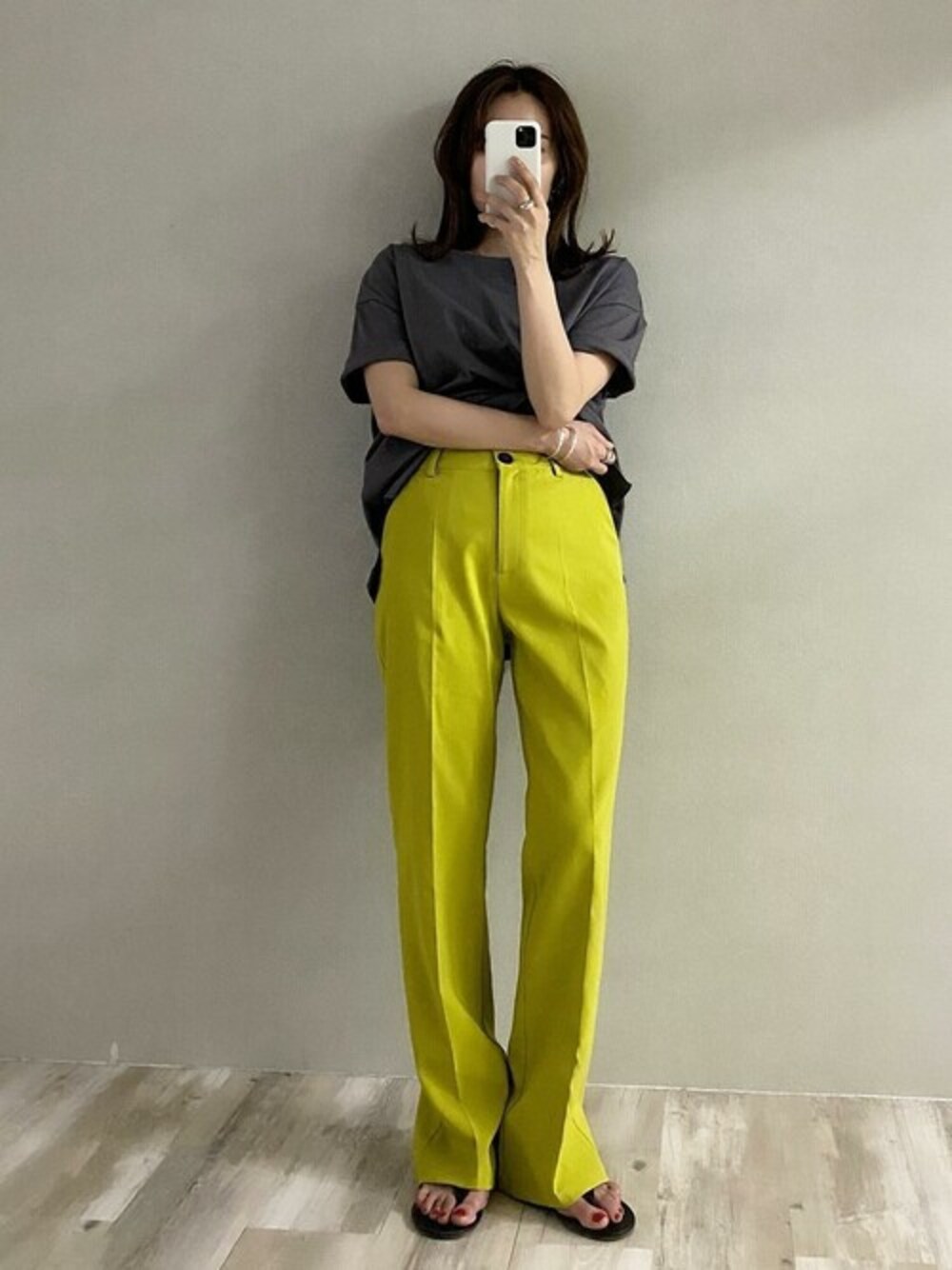 ライムカラーのパンツを主役にコーディネート。 黒Tだとcoolになりすぎたので、チャコールTでマイルドに! 微フレアスラックス [M3339] [ ノーマル/パネル ]半袖ボーダーシンプルカットチュニック [ C4631 ] 着用アイテムから飛べない商品&ZOZOTOWNで未販売の商品は、神戸レタスのサイト内で商品ID検索が出来ます♡