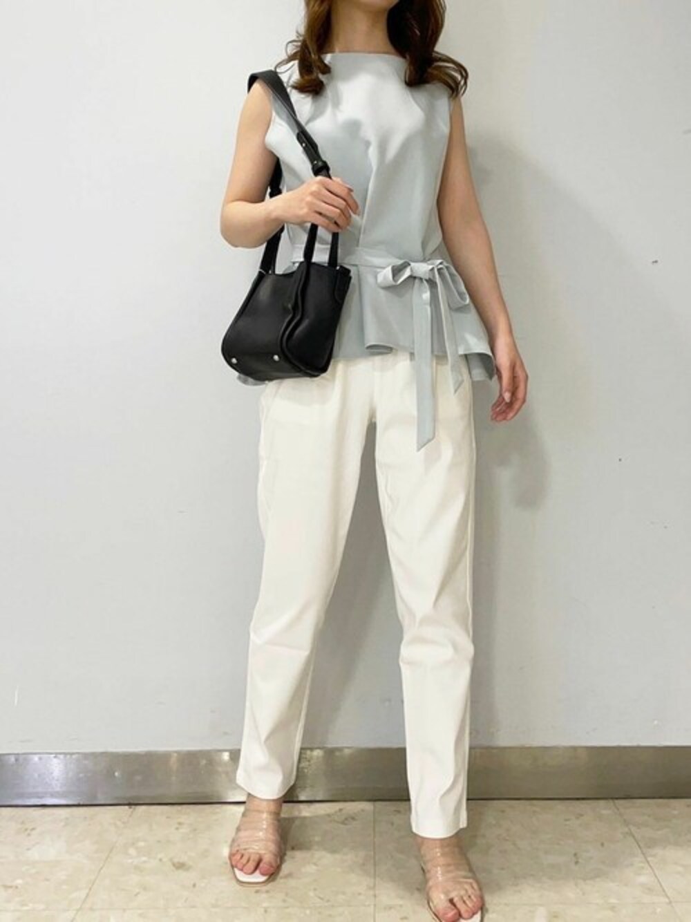 大人気のトップスを白パンツ合わせで清楚な女性コーディネートに♪ [選べるウォッシャブルTブラウス[SS] [C4621] スーパーストレッチテーパードパンツ [M3594] クリアチューブベルトサンダル [I2084] キューブミニバッグ [B1484] 着用アイテムから飛べない商品&ZOZOTOWNで未販売の商品は、神戸レタスのサイト内で商品ID検索が出来ます♡