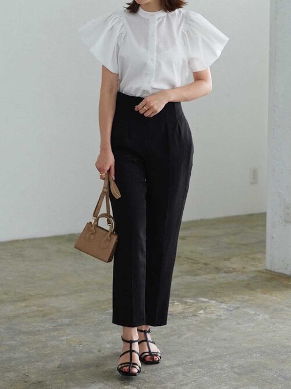 フリルブラウスのモノトーンコーディネート フリルスリーブバンドカラーシャツ [C6372] [ 水野佐彩さんコラボ ]ハイウエストタックテーパードパンツ [M3608] Tラインストラップサンダル [I2445] 着用アイテムから飛べない商品&ZOZOTOWNで未販売の商品は、神戸レタスのサイト内で商品ID検索が出来ます♡