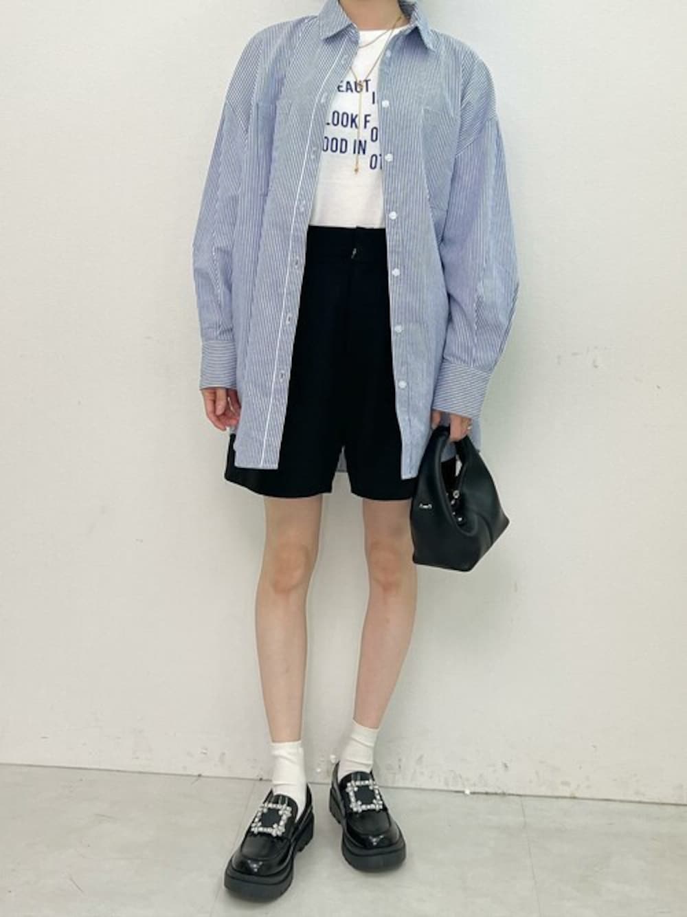 ブルーのシャツをマニッシュにコーディネート。 ストライプビッグシャツ [C6278] ハイウエストショートパンツ [M3497] ビジュー厚底ローファー [I2469] 選べるプリント長袖Tシャツ [C6342] 着用アイテムから飛べない商品&ZOZOTOWNで未販売の商品は、神戸レタスのサイト内で商品ID検索が出来ます♡