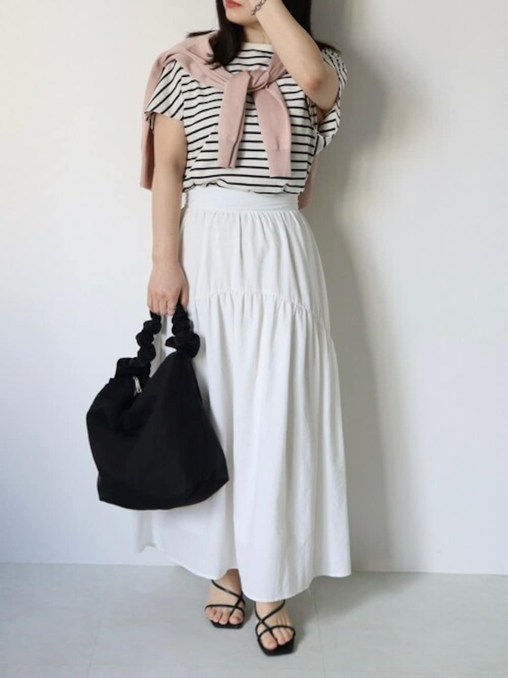 甘めな印象のホワイトスカートをボーダーと合わせてカジュアルダウンさせたコーディネート [ 選べる3サイズ ] コットン100%シンプルTシャツ [C5106] [ プチレタス ]ラウンドギャザー切り替えロングスカート [M3672] ショルダーフリルバッグ [B1568] 着用アイテムから飛べない商品&ZOZOTOWNで未販売の商品は、神戸レタスのサイト内で商品ID検索が出来ます♡
