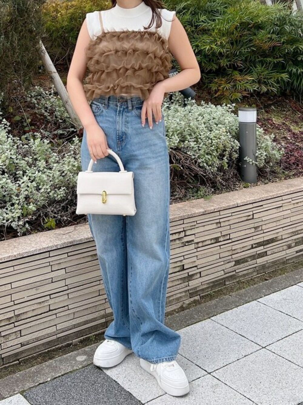 シンプルスタイルを華やかにしてくれるチュールビスチェをポイントにした夏のデニムコーディネート ネック2タイプリブニットトップス [C6611] ティアードフリルチュールビスチェキャミソール [C7072] 着用アイテムから飛べない商品&ZOZOTOWNで未販売の商品は、神戸レタスのサイト内で商品ID検索が出来ます♡