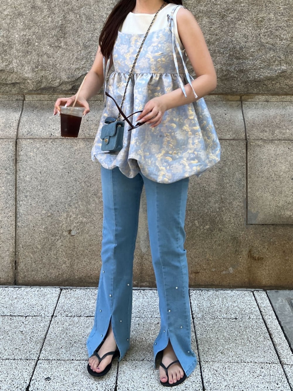 柄がポイントになるトップスをブルーでまとめたカラーコーディネート ジャガードペプラムバルーントップス [C7242] 選べる2タイプ スリットストレッチデニム [M4073] 着用アイテムから飛べない商品&ZOZOTOWNで未販売の商品は、神戸レタスのサイト内で商品ID検索が出来ます♡