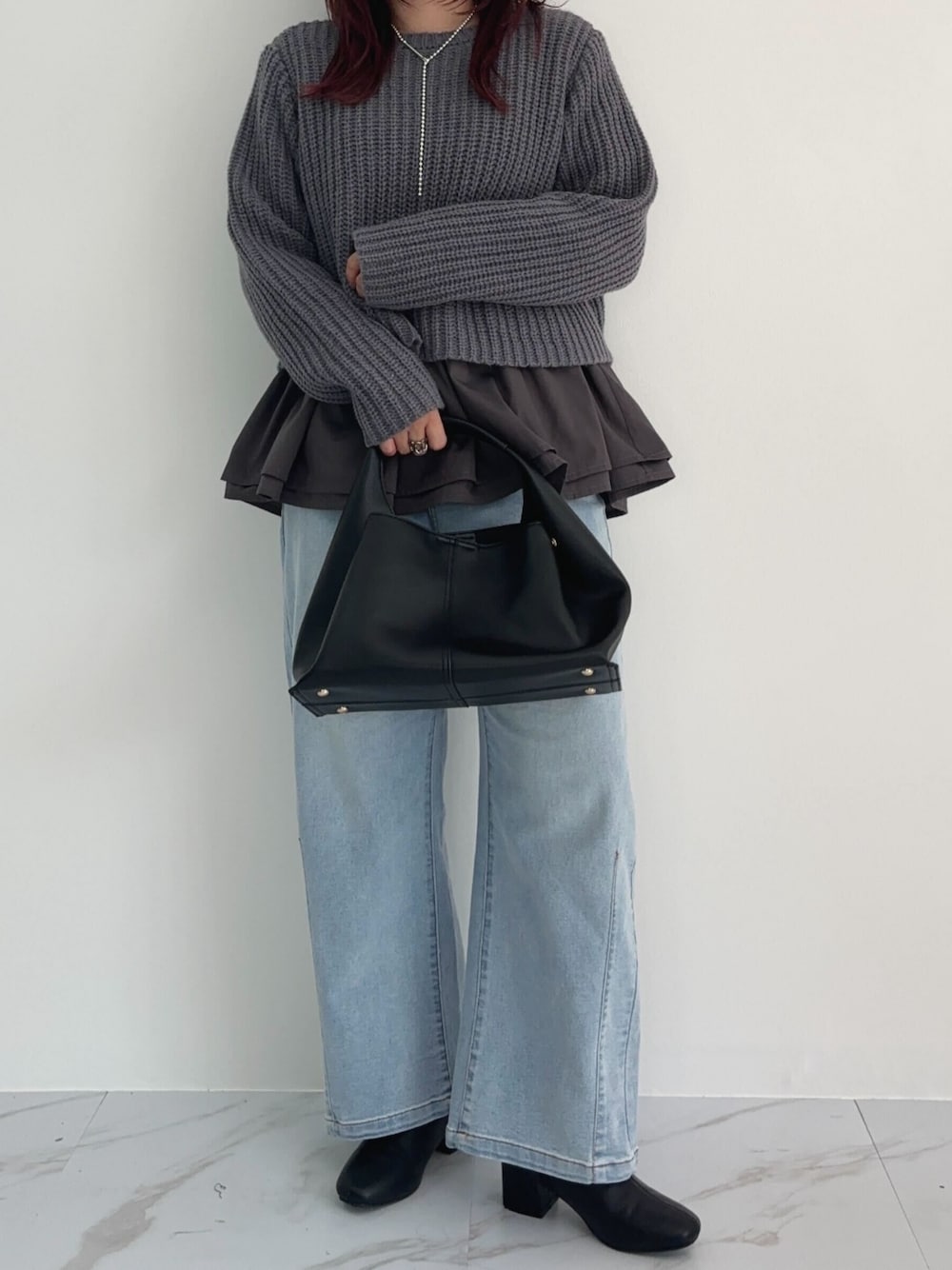 AWアイテムのニットを合わせたデニムコーディネート [ プチレタス ] ニット×ブラウスセット [N1089] 接触冷感カーブデニムパンツ [M4106] ソフトフェイクレザーワンハンドルバッグ [B1587] 着用アイテムから飛べない商品&ZOZOTOWNで未販売の商品は、神戸レタスのサイト内で商品ID検索が出来ます♡