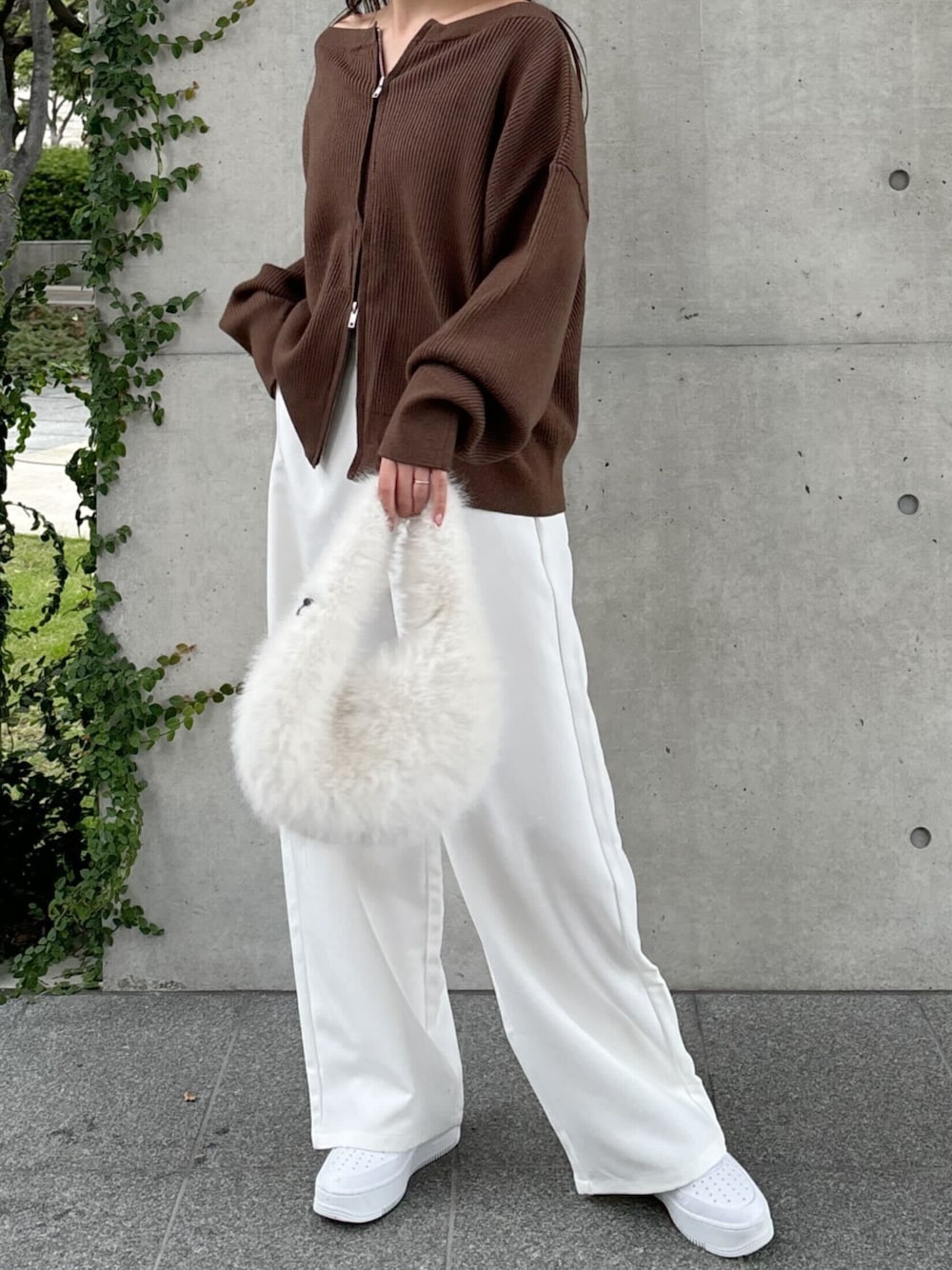ブラウン×ホワイトの秋カラーコーディネート。オフショルニットで大人カジュアルに。 ダブルジップオフショルニットトップス [C7323] 選べるサイズ カーブすぎないカーブパンツ [M4053] チェーンショルダー付きファーバッグ [B1596] 着用アイテムから飛べない商品&ZOZOTOWNで未販売の商品は、神戸レタスのサイト内で商品ID検索が出来ます♡