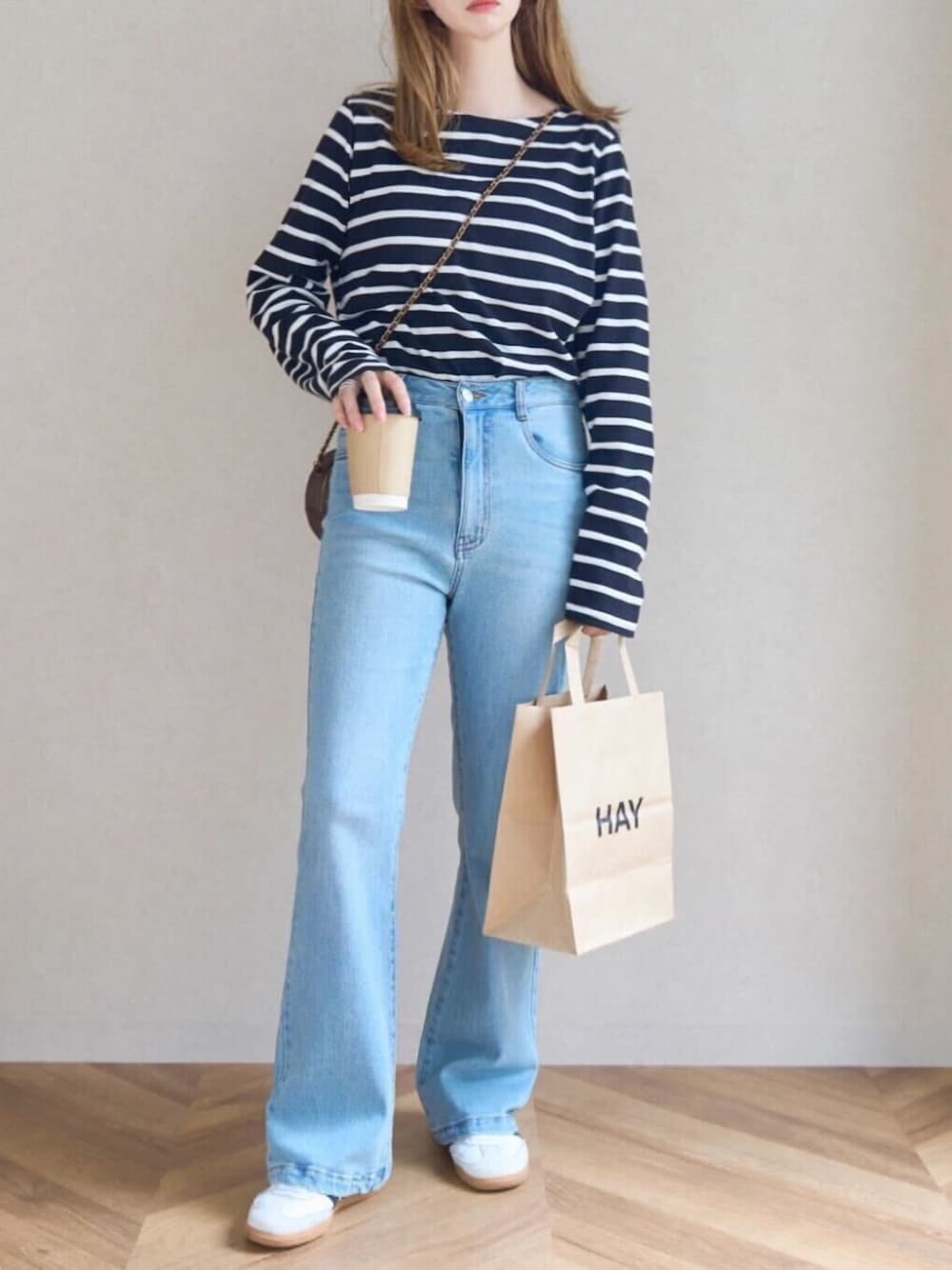 ボーダー×デニムで秋の定番カジュアルコーディネート ソフトフレアデニムパンツ [M4128] キルティングサークルチェーンバッグ [B1510] 着用アイテムから飛べない商品&ZOZOTOWNで未販売の商品は、神戸レタスのサイト内で商品ID検索が出来ます♡