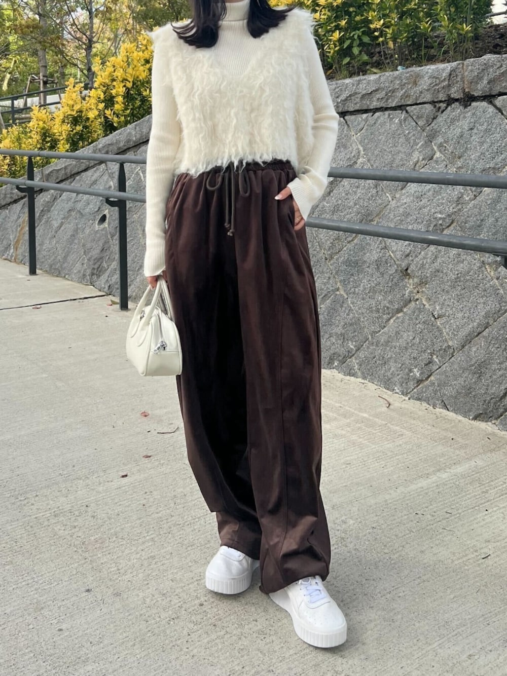 季節感あるベロアやシャギーを取り入れた、おすすめ秋コーディネート ベロアカーブパンツ [M4138] 袖ボタンリブニットトップス [C7329] シャギーニットベスト [N1098] 着用アイテムから飛べない商品&ZOZOTOWNで未販売の商品は、神戸レタスのサイト内で商品ID検索が出来ます♡