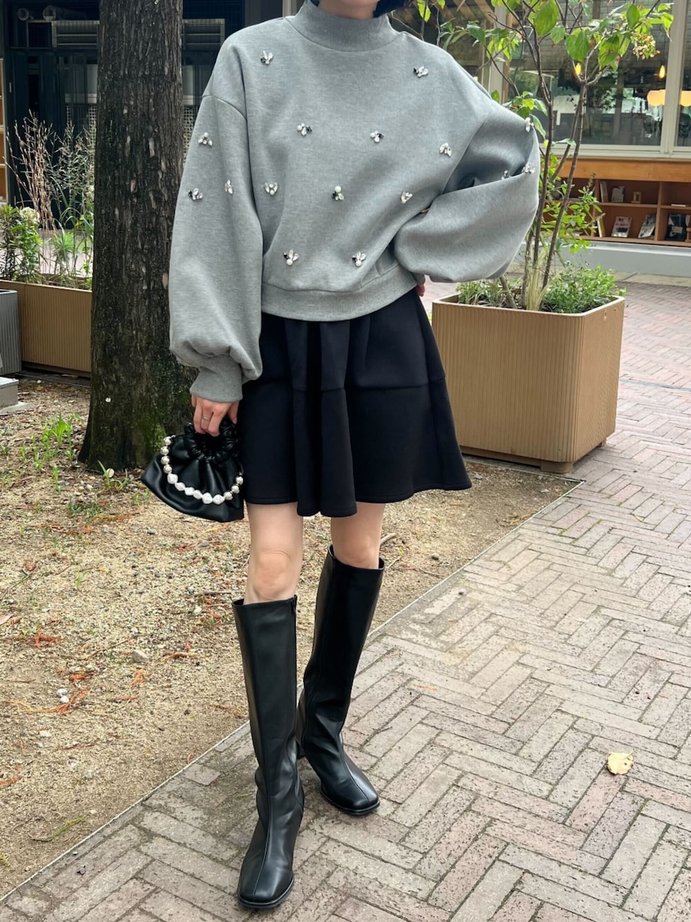 ビジューがポイントになる、ガーリーなスウェットコーディネート ビジューダイバーモックネックトップス [C7311] フェイクレザーロングブーツ [I2572] 着用アイテムから飛べない商品&ZOZOTOWNで未販売の商品は、神戸レタスのサイト内で商品ID検索が出来ます♡