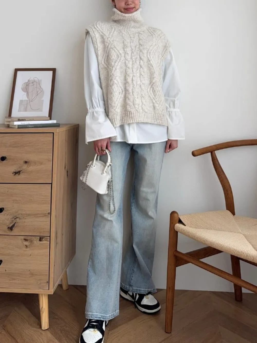 神戸レタス(KOBE LETTUCE本部)のベスト「ケーブルハイネックニットベスト」を使ったコーディネート