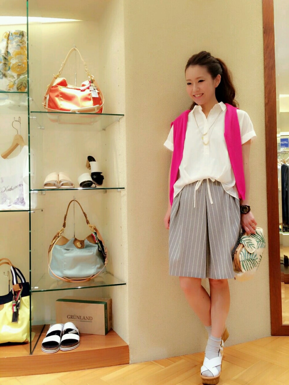シャツ×ストライプスカートのワンピース♪ 差し色にピンクのカーデを肩掛け☆