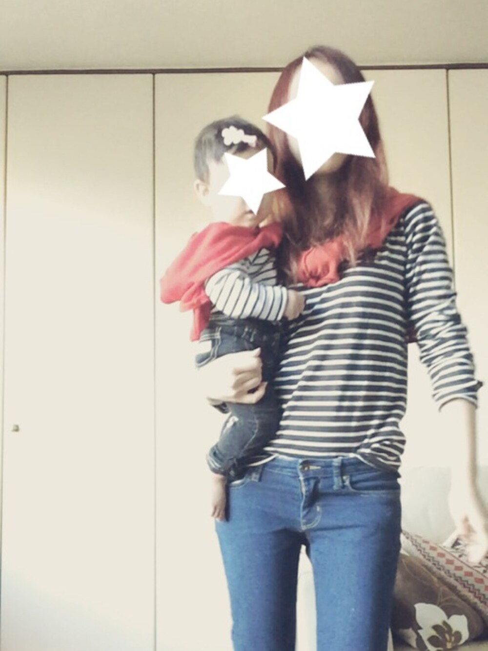 ホワイト系のTシャツ/カットソー、レッド系のカーディガン/ボレロ、ブルー系のデニムパンツを着用したキッズの冬コーディネートの1枚目の写真