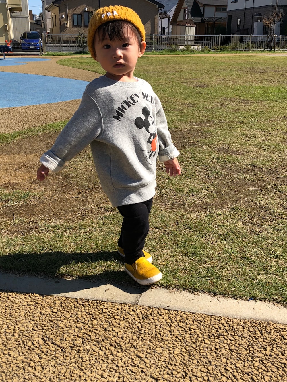 UNIQLOのミッキースエット💓 100センチと大きめサイズが、彼女が彼氏の服を着てみた感があって可愛い…🤤 帽子と靴は黄色で揃えてみました💕