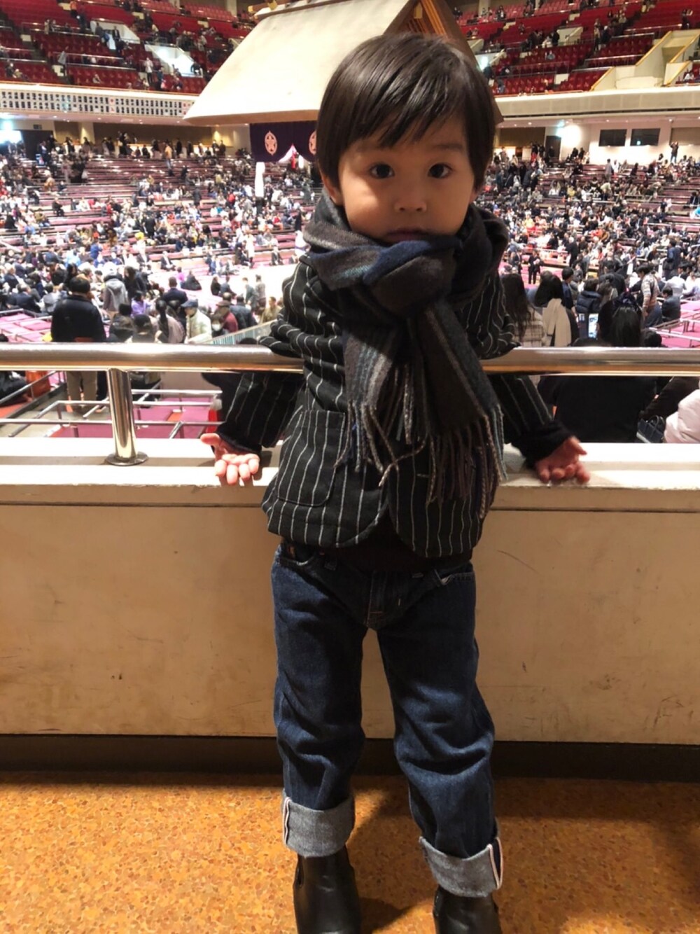 今日は豪風の断髪式を観に行きました👏 そのため、ジャケットコーデできちんと感を出してみました💓 マフラーはジジから借りたもの🧣大人用でも巻き方でなんとか子どもも着けれることに気づきました😳