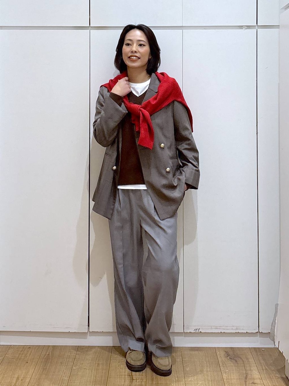 ココ(GLOBAL WORK ららぽーと横浜)のテーラードジャケット「お手入れラクラクセットアップ/ダブルジャケット/498372」を使ったコーディネート