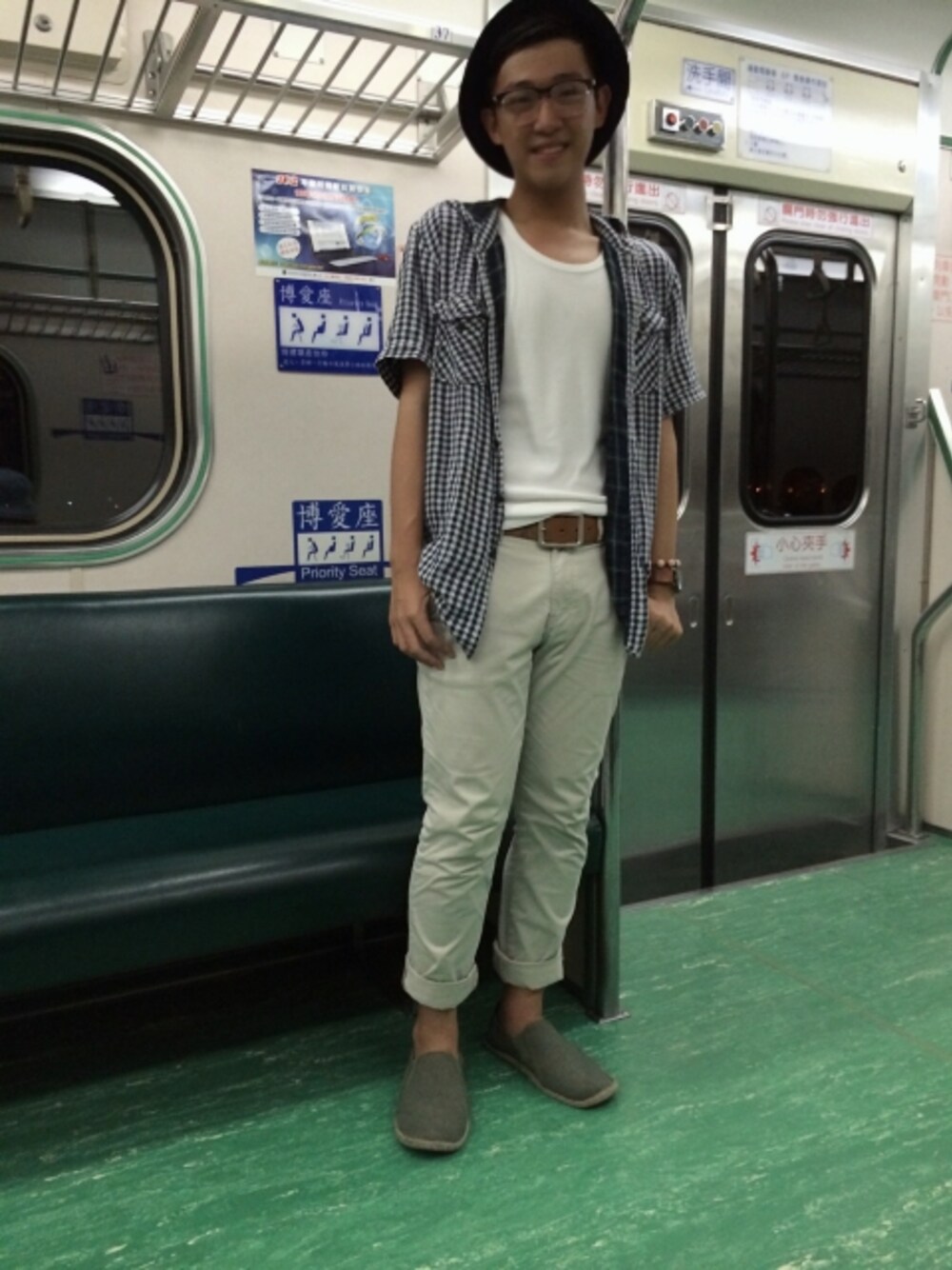 來去逛夜市 夏天的休閒穿搭 #NET千鳥紋短袖襯衫#Rage blue漁夫帽#綠色草編鞋(日本神戶H&M購入)#G.U牛仔褲