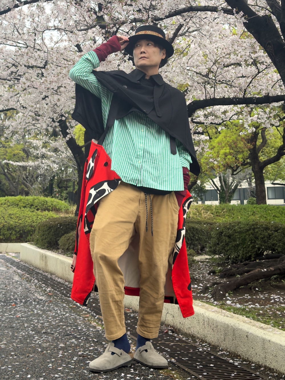昨日のコーデのチノパンとシャツ同じ🤣‼️ でも他のアイテムが変わるとこんなにも違うでしょう😆🤭👍 自分の思う面白いコーデ、ワクワクするコーデ。誰かの為というより自分が楽しんでこそのファッション。🙂そういうモノが巡り巡って誰かにも届くと良いな 自分が楽しくなくっちゃ、見てるひとも楽しめない🥰 ドッキングコートで黒と赤だけで全身まとめても良い感じですが敢えて色々なカラーや他ジャンルのアイテムを混ぜてます✨