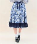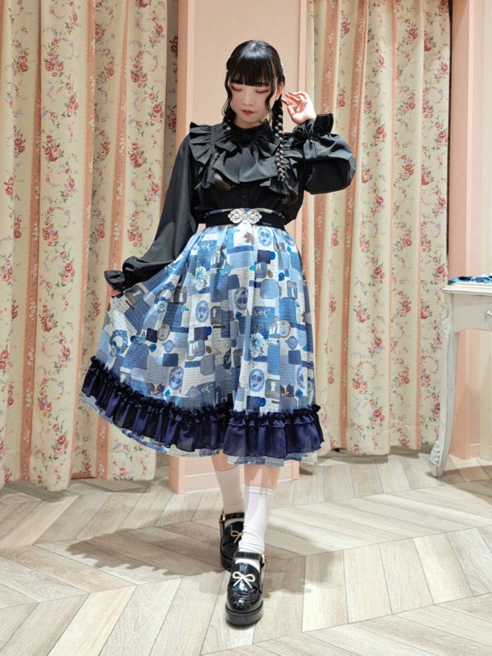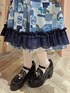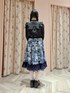 ご覧いただきありがとうございます🌷 シーリングスタンプやシール、押し花などをコラージュした様なオリジナルプリントのスカートに黒ブラウスを合わせたコーデ🖤 スカートの裾にたっぷりとフリルをあしらいふんわりとしたボリュームに😉 大きなリボンがポイントのブラウスのお袖や肩がフリルになっていて可愛さアップ💕🥺