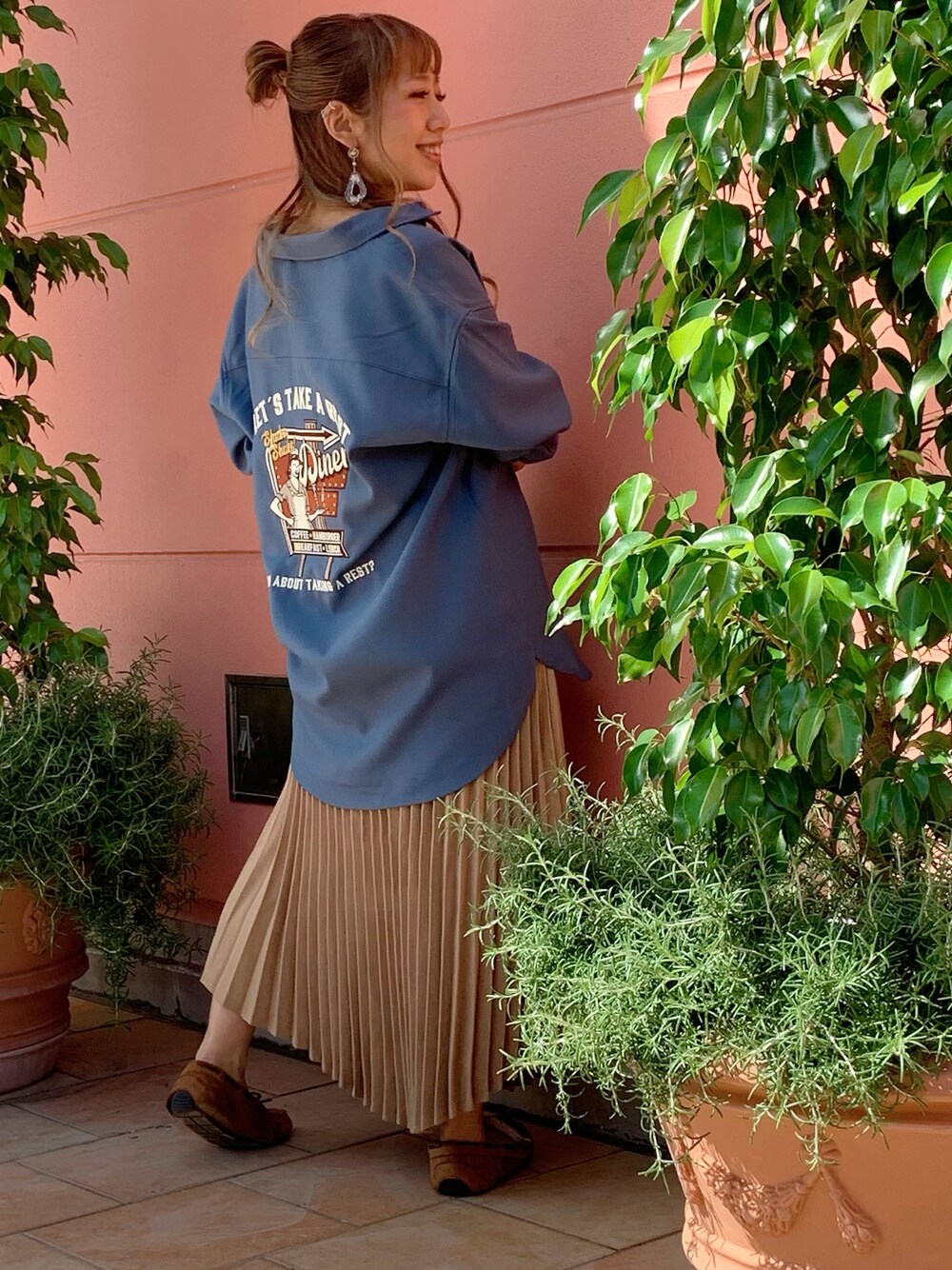 men's大きめシャツ👔と 万能なベージュスカート💓 トレンドのプリーツを合わせて🥰