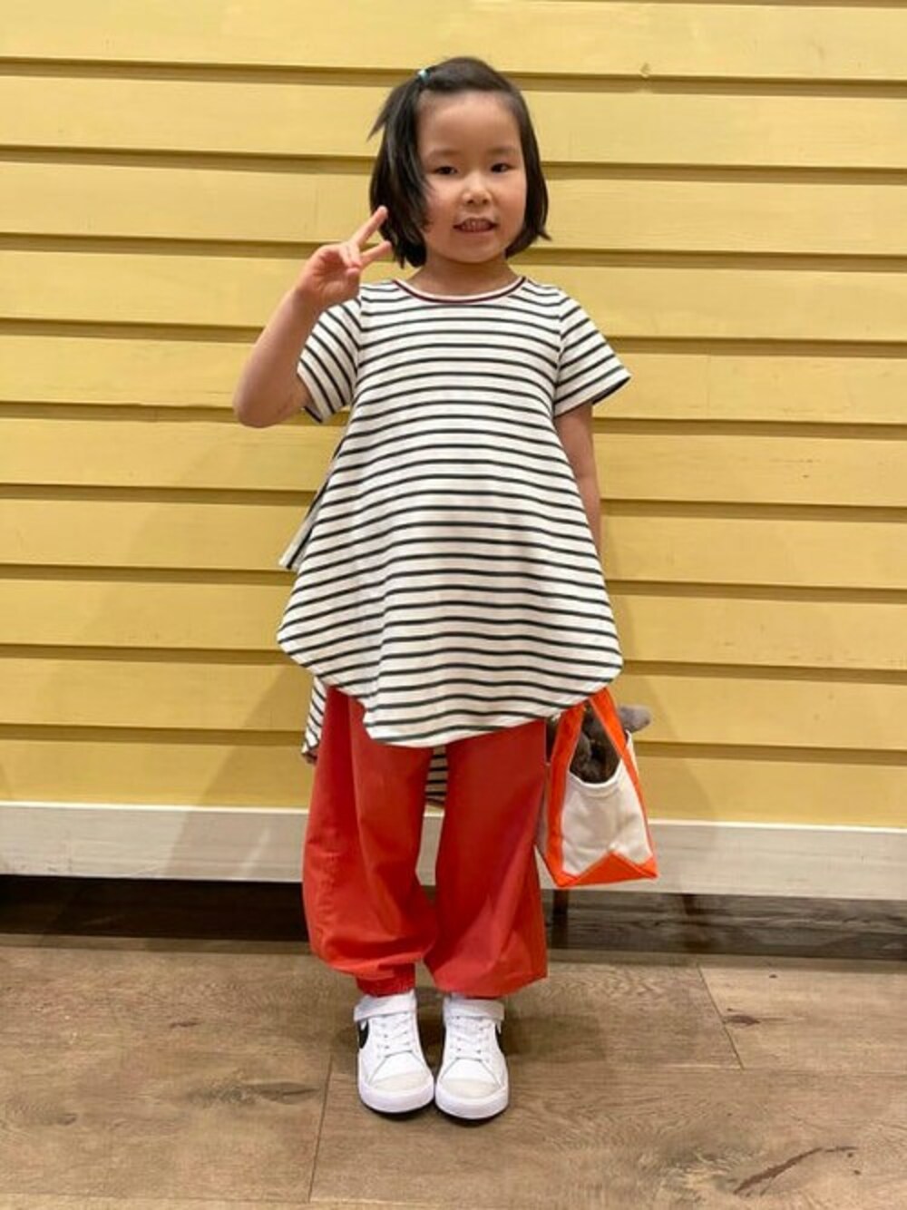 シルエットで違いが出る!ボーダーTシャツとシャカシャカパンツ♩春夏はいつもと違った雰囲気のお洋服にも挑戦してみませんか? 【Model : H116(cm)】