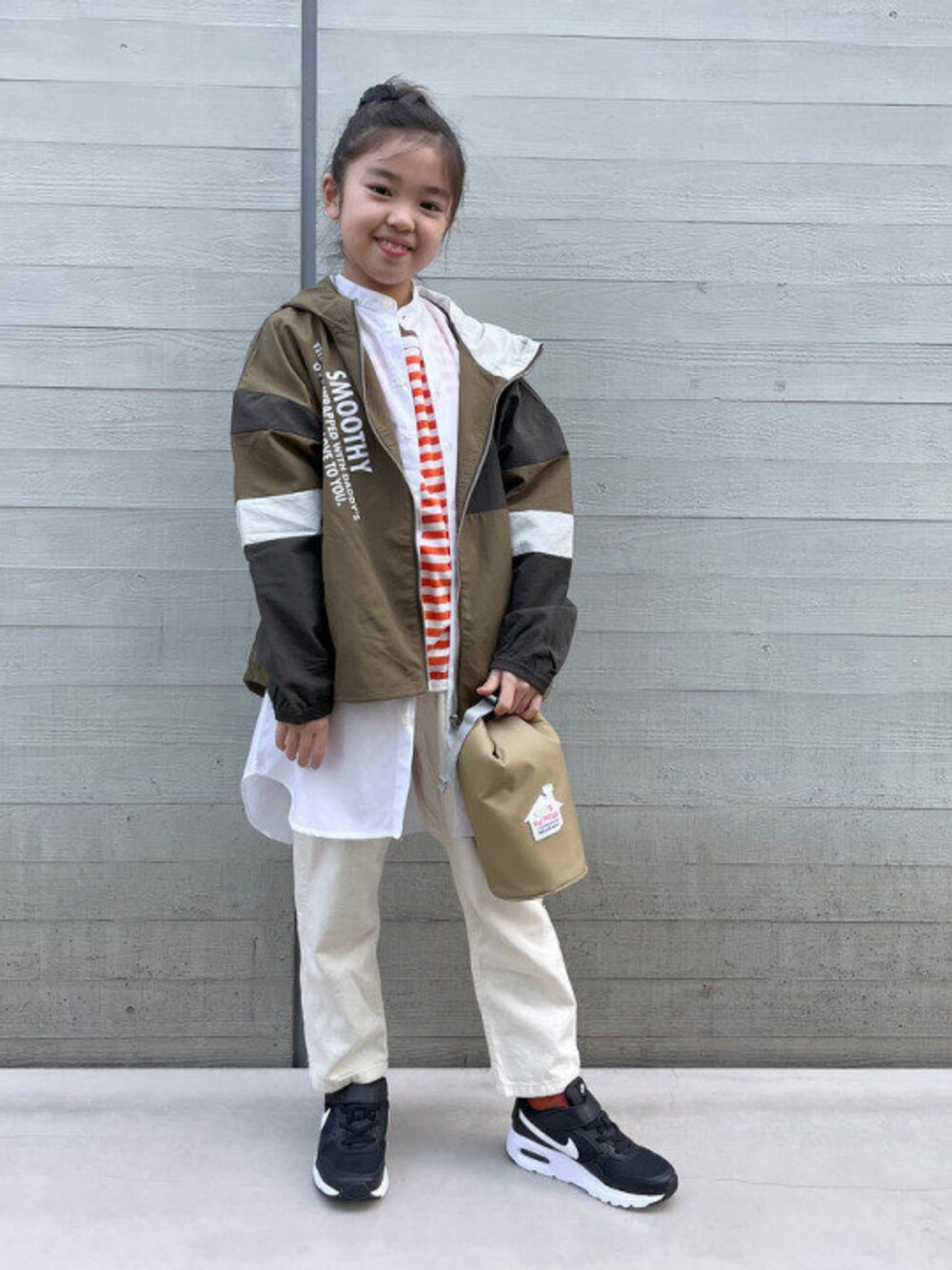 ((もうすぐ春♩))お天気のいい日はランチを持って公園へ!なコーディネート。カーキに白を合せると、爽やかで春らしい印象になります。【 Model : H130(㎝)】