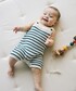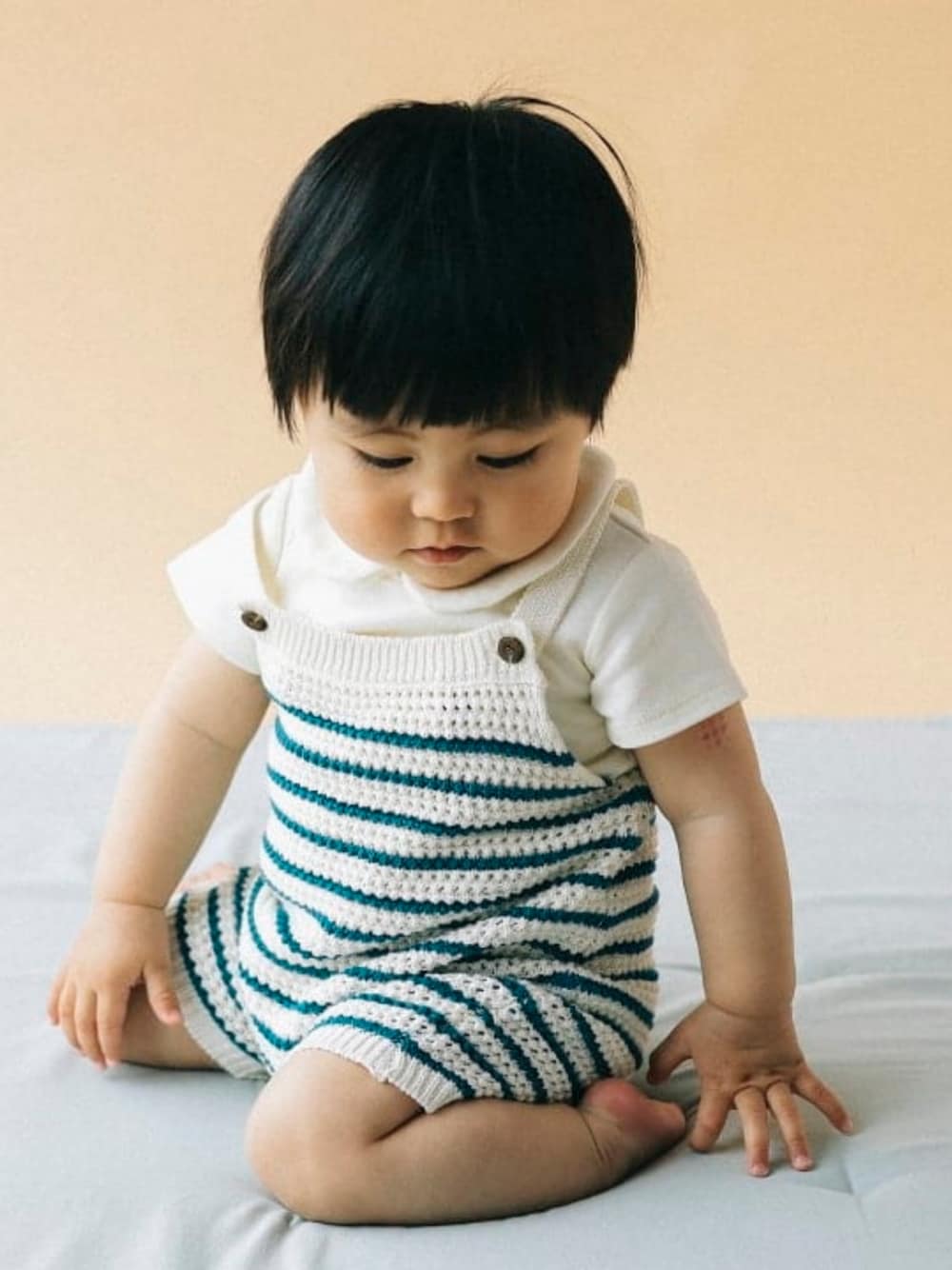 【 身長:H73(cm)着用サイズ:70】 マリン漂うボーダーが夏らしいニットのロパース☆インナーを合わせれば今の季節にピッタリの装いに!ベビー服はサロペットタイプが多いけど夏が来るまでのコーディネートに困りますが、襟付きボディスーツはインナーにおすすめです! 季節に応じたサイズ選びが難しいベビー服も、春・夏でコーディネート出来るのは嬉しいですね♪