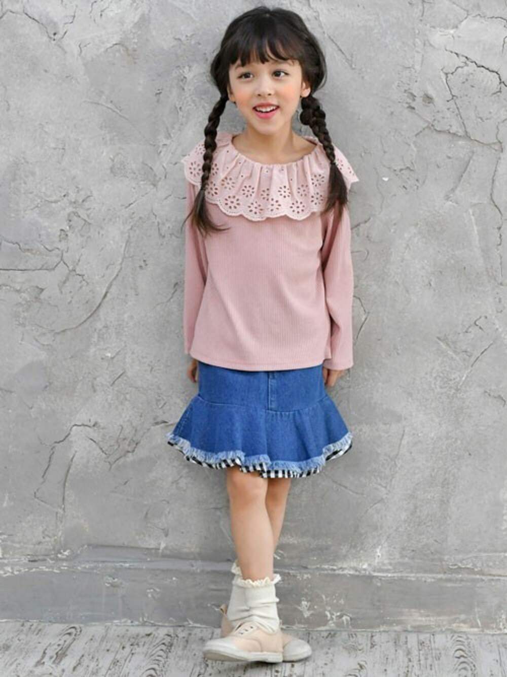 子供服Beeのデニムスカート「裾ギンガムフレアデニムスカート」を使ったコーディネート