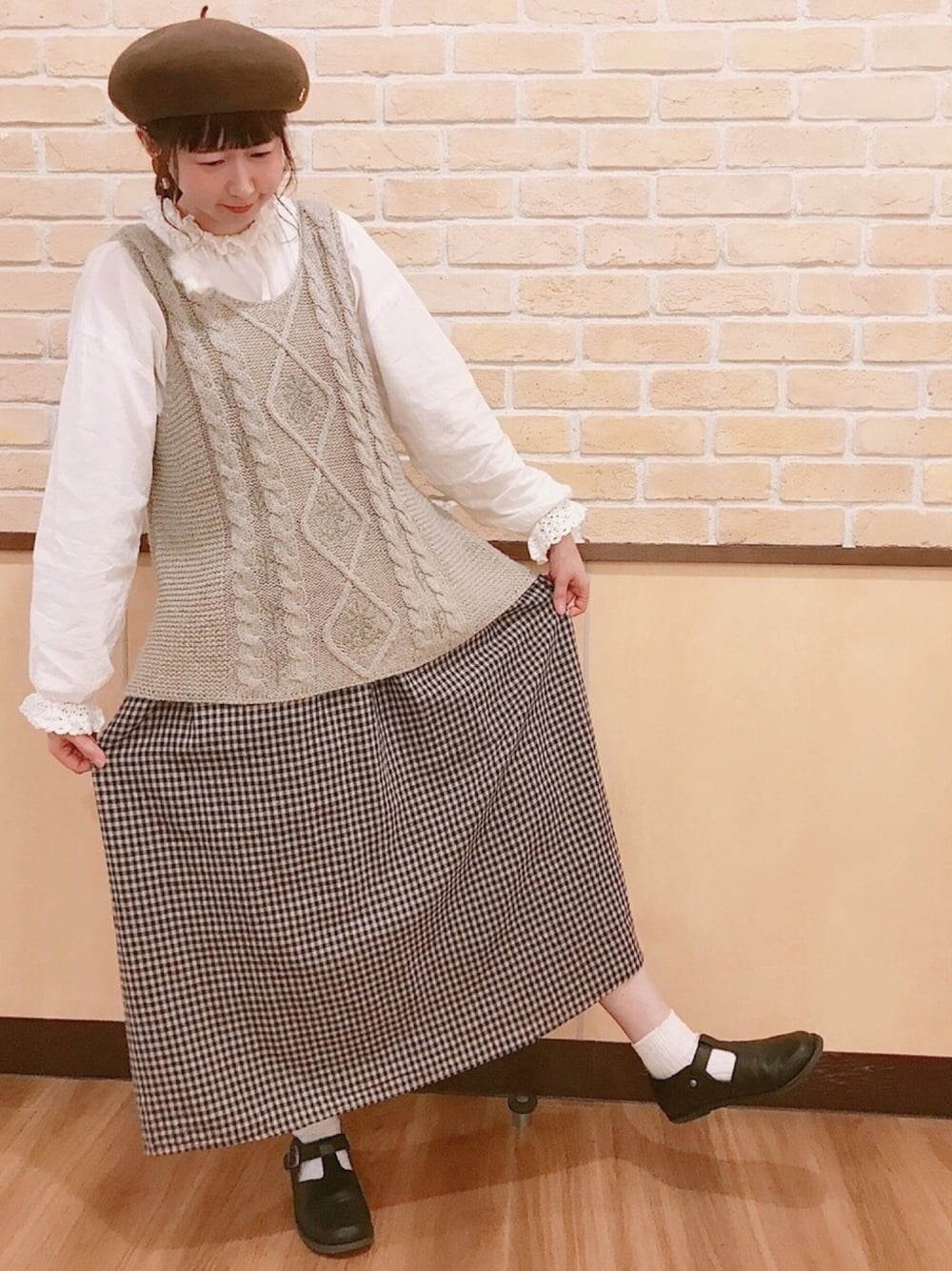今日のコーディネート.◌𓈒𖡼𓂂 この画像をスタッフに見せたら、 あ〜した 天気になぁ〜れ って小石を蹴っておまじないしてます って感じですよね◡̈⃝ と言われたのでテーマはこれです!笑 やっぱり襟レースのブラウスに ギンガムチェックのスカート って最高に可愛いと思います( ◜௰◝ ) 朝晩は涼しいので、 ニットベストが丁度良き◎