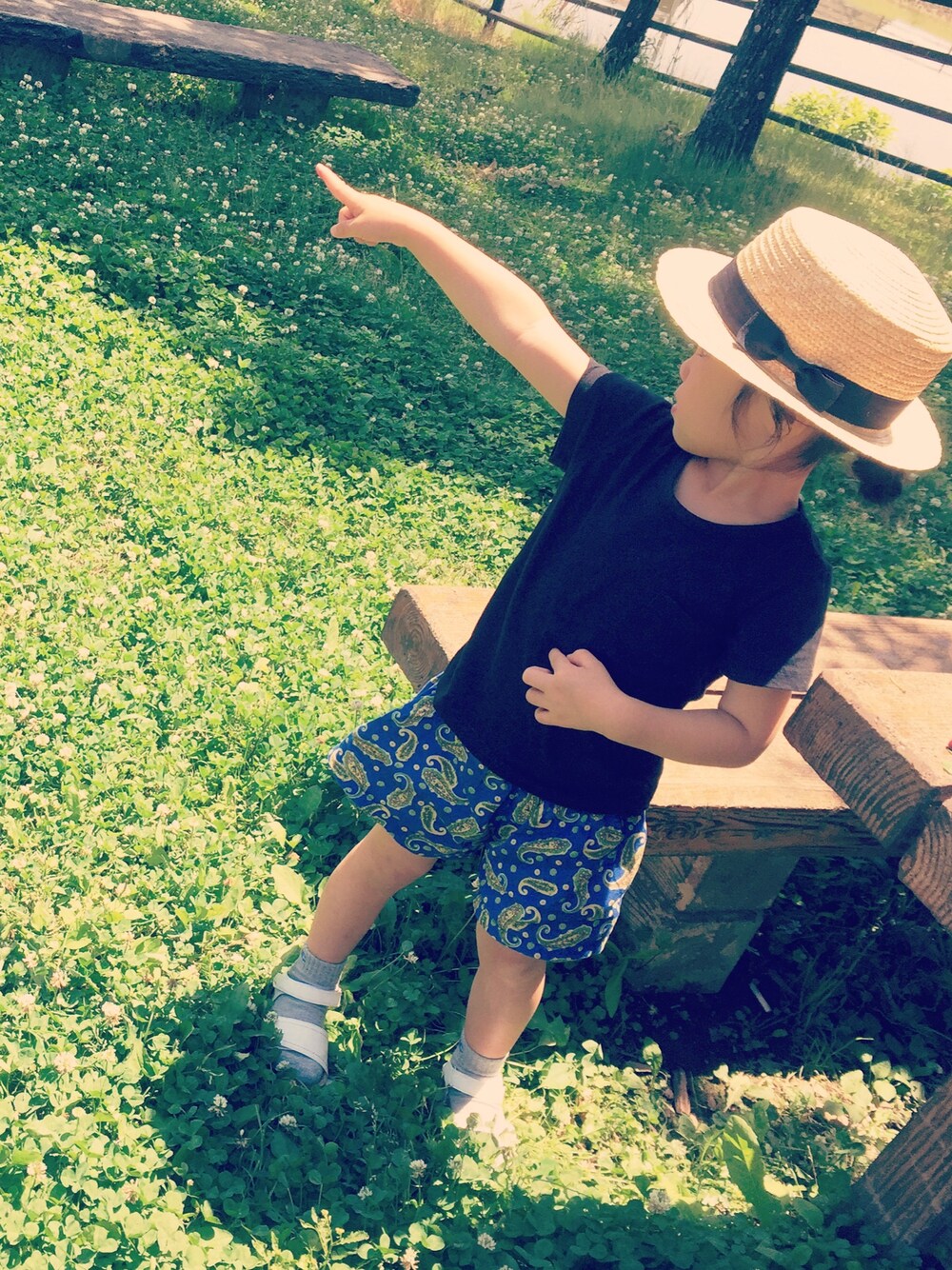 パパあっちで消防の練習してるよー!って◡̈⃝ 三つ葉のじゅうたんでお散歩