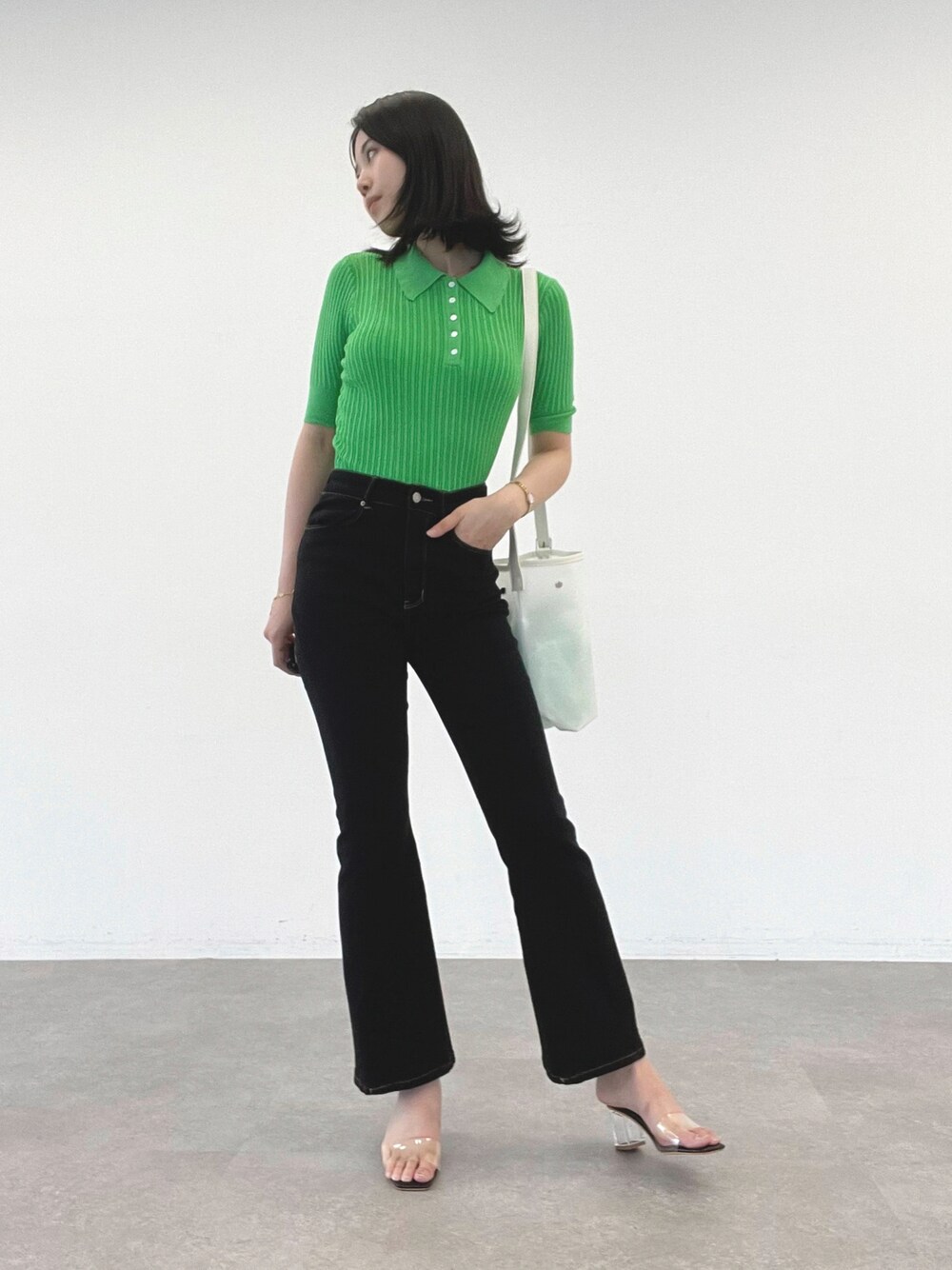 170cm ビビットグリーンとフレアパンツで 韓国テイストコーデ [着用感] ■トップス 着用サイズ : Fサイズ こちらのトップスは、薄手のニット素材のためかなり伸縮性があり、着心地や動きやすさがとても良いです。 発色がとても綺麗で、シンプルなボトムスと合わせるだけで映えるアイテムです。 ■ボトムス 着用サイズ : Mサイズ 履いてみると想像以上にストレッチが効いていて、屈伸してもストレスなく動けます。ランニングにも行けちゃいそう、なくらい動きやすく快適な履き心地でした。フレアなのでスタイル良く見せてくれます。 ■バッグ 収納力があり、水に強いのでジム使いやプール、海に活躍しそうなアイテムです。