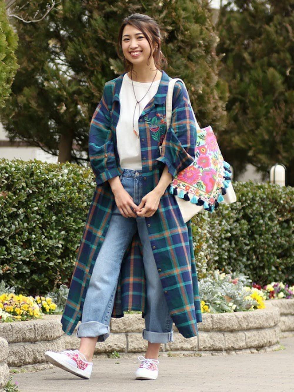 春もチェックがきてるみたい♡ 刺繍がかわいいおすすめワンピ! 今日はデニムスタイルに、ガウンとして合わせてみました♪
