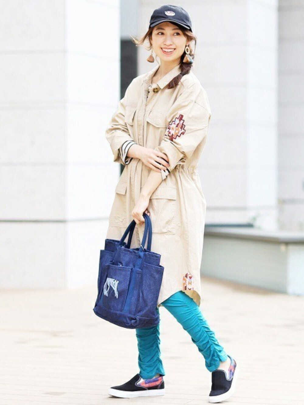 ミリタリーなシャツワンピを主役にカジュアルコーデ。 レギンスはターコイズブルーをチョイスして差し色に★