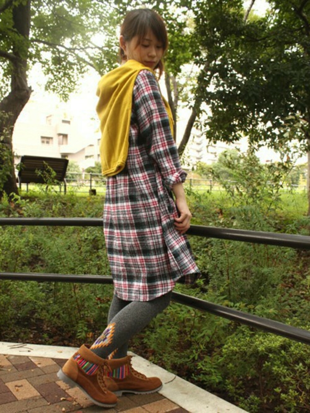 トレンドのチェック柄ワンピにカーディガンを羽織って。 肩掛けカーディガンのマスタードと足元にチラリと覗くプリント入りのタイツで、 コーデにアクセントを添えて♪