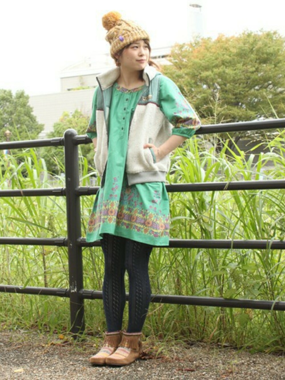 女の子らしい民族調のワンピースにボア素材のベストを合わせてカジュアルに☆ スポーティー×ガーリーな表情でギャップを狙ったコーディネートに!