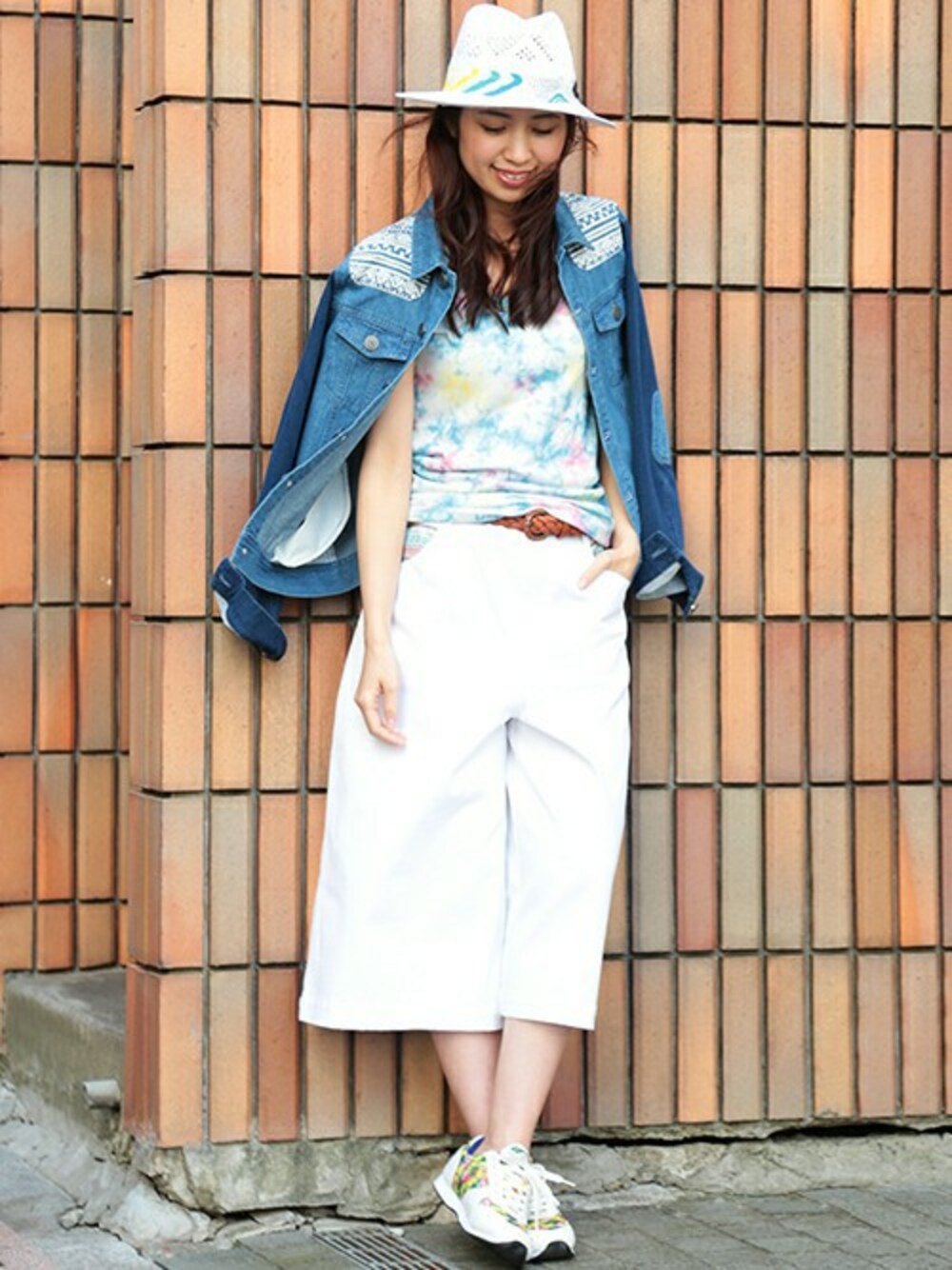白ボトムスにスニーカーを合わせて涼しげなスポーツミックスコーデ。 程よい色合いのタイダイのタンクトップはボヘミアンスタイルにマッチしますよ☆ 青と白のコーデはマリンコーデとしても◎ ジャケットを合わせても暑苦しく見えないのでオススメです!