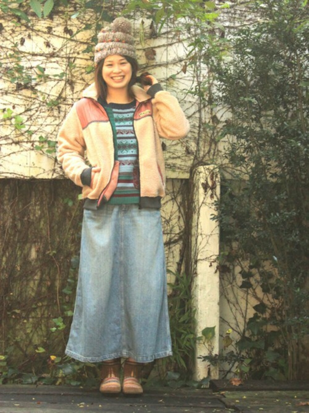 アウトドアな雰囲気のあるボア素材のジャケットをスカートに合わせて可愛らしい表情に仕上げました。 ニット素材を合わせることでよりあたたかみのある冬コーデに。