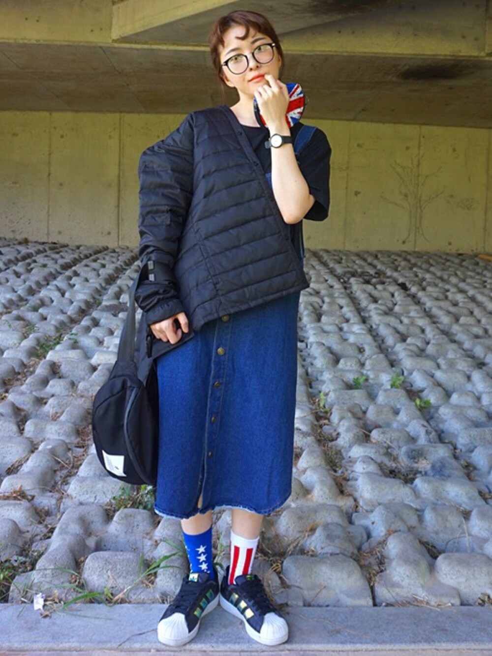 ブラック系のスニーカー、ブルー系のドレスを着用したレディースの秋コーディネートの1枚目の写真