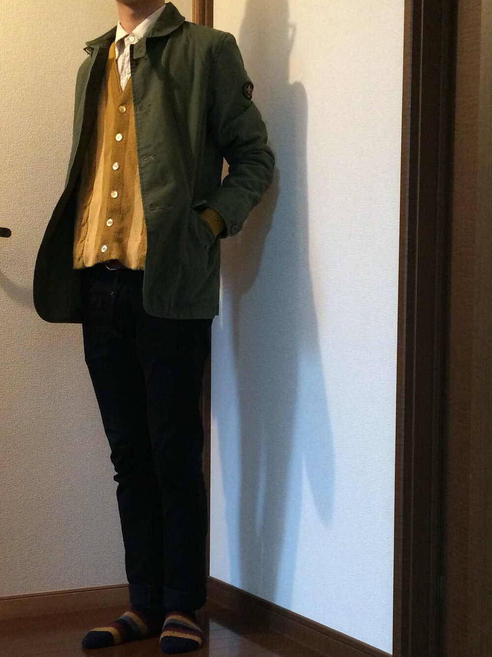 「細め」意識してみました。 スキニーはもちろん、カーディガンの柄が縦だし、ジャケットの肩とか腕周りがスッキリめのシルエットなのでいい感じかなと! ミリジャケなのにスッキリ!?みたいなのね、やってみたかったんです。 あと写真撮って思ったのは靴下かわいい。