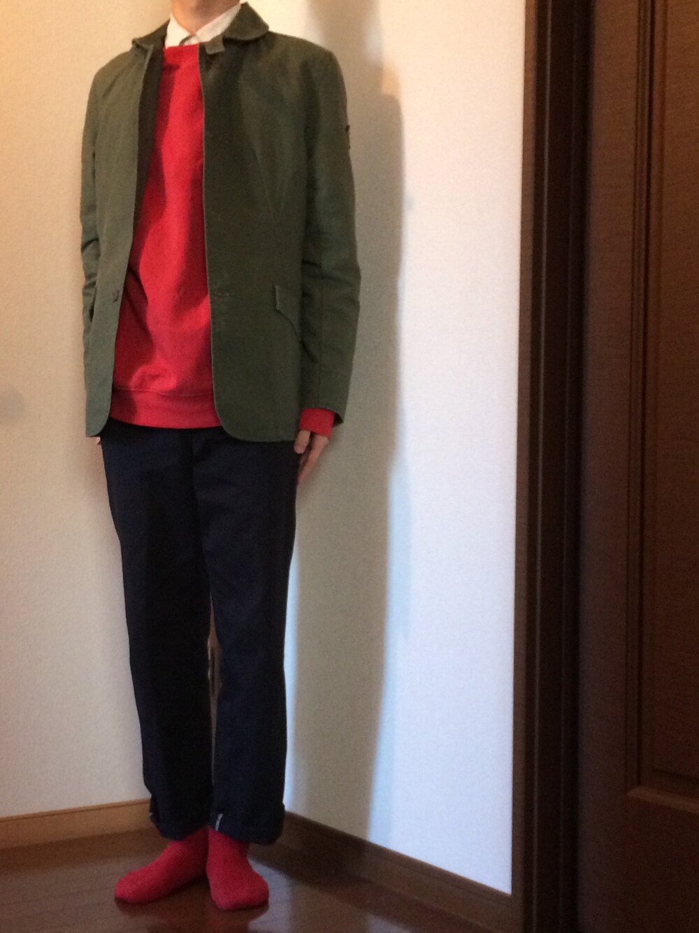 シンプルに! 袖から赤が覗く感じが好きです。 思えば赤ってそんなに着たことないかも もうちょっと攻めてもいいかな…笑