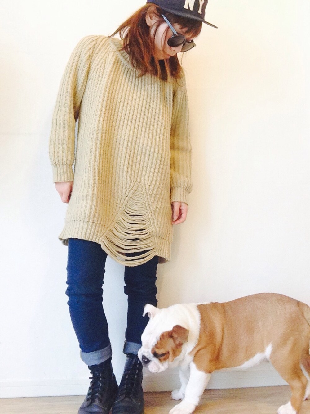 春っぽい格好したかったけど、 寒さに負けました。 ニットばんざーーーい😂😂😂 おしゃれは、我慢… できませんでした。 しげちゃんは、めっちゃ靴紐噛んできます 😂😂😂 デニム:GU