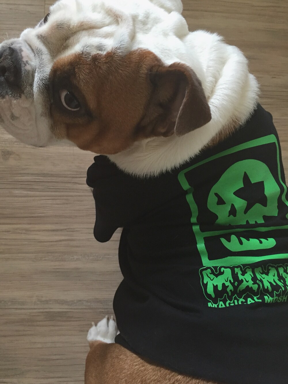おひさしぶりです。 しげちゃん(犬)に新しいお洋服を買いました。 M×M×MのこどもっしゅロゴTです。 XLサイズです。人間の150cm相当です。 まほうでわんぱくなはみだしものたち!の 仲間入りしました〜✌︎✌︎✌︎