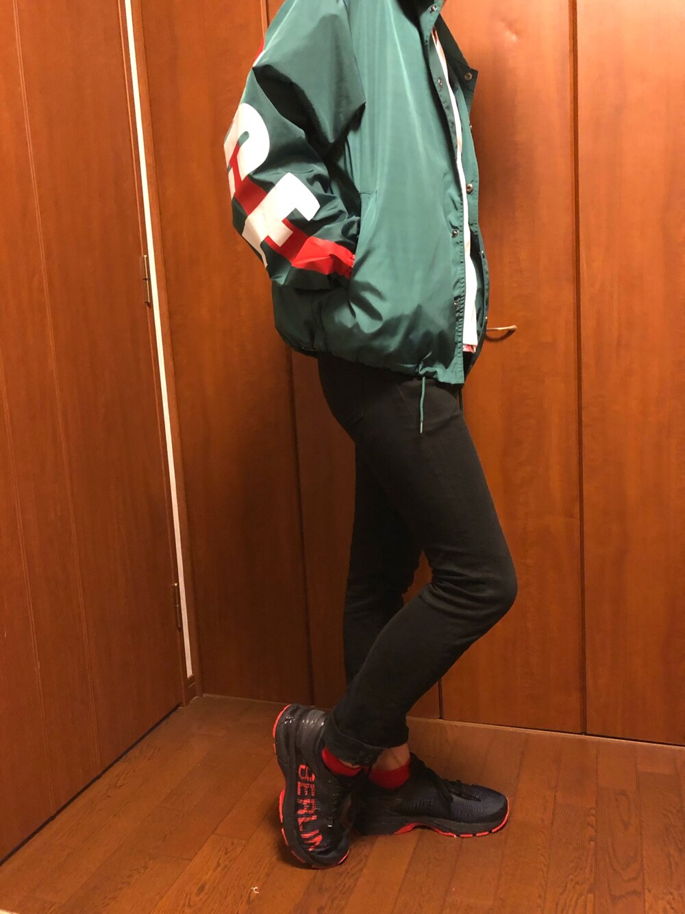 こんにちは👀 先日アメ村に行った時にオススメされて買った派手なアウターを着てみました笑 上が派手なので下は黒スキニー一択でした😌 (黒スキニーは最強です笑) アウターに赤のラインが入ってるので、靴下、靴にも赤を使ってみました! asicsの靴履きやすいし、オシャレなのも多いので最高です😍