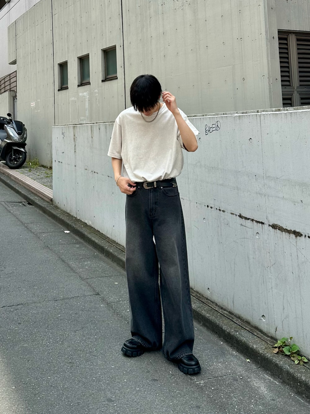 【Tシャツ】着用サイズXL ユニセックスのベーシックT。 サイズはジャストな感じなのでXLでゆったり着てます。 柔らかく着心地もいいので、インナーとしても使いやすくておすすめです。 【デニム】着用サイズL オールシーズンで活躍するワイドデニム。 シルエット・色味最高です。 カジュアルにもキレイめにも使える万能なデニムで、トップス・アウター選ばず穿けるのも嬉しいポイント。