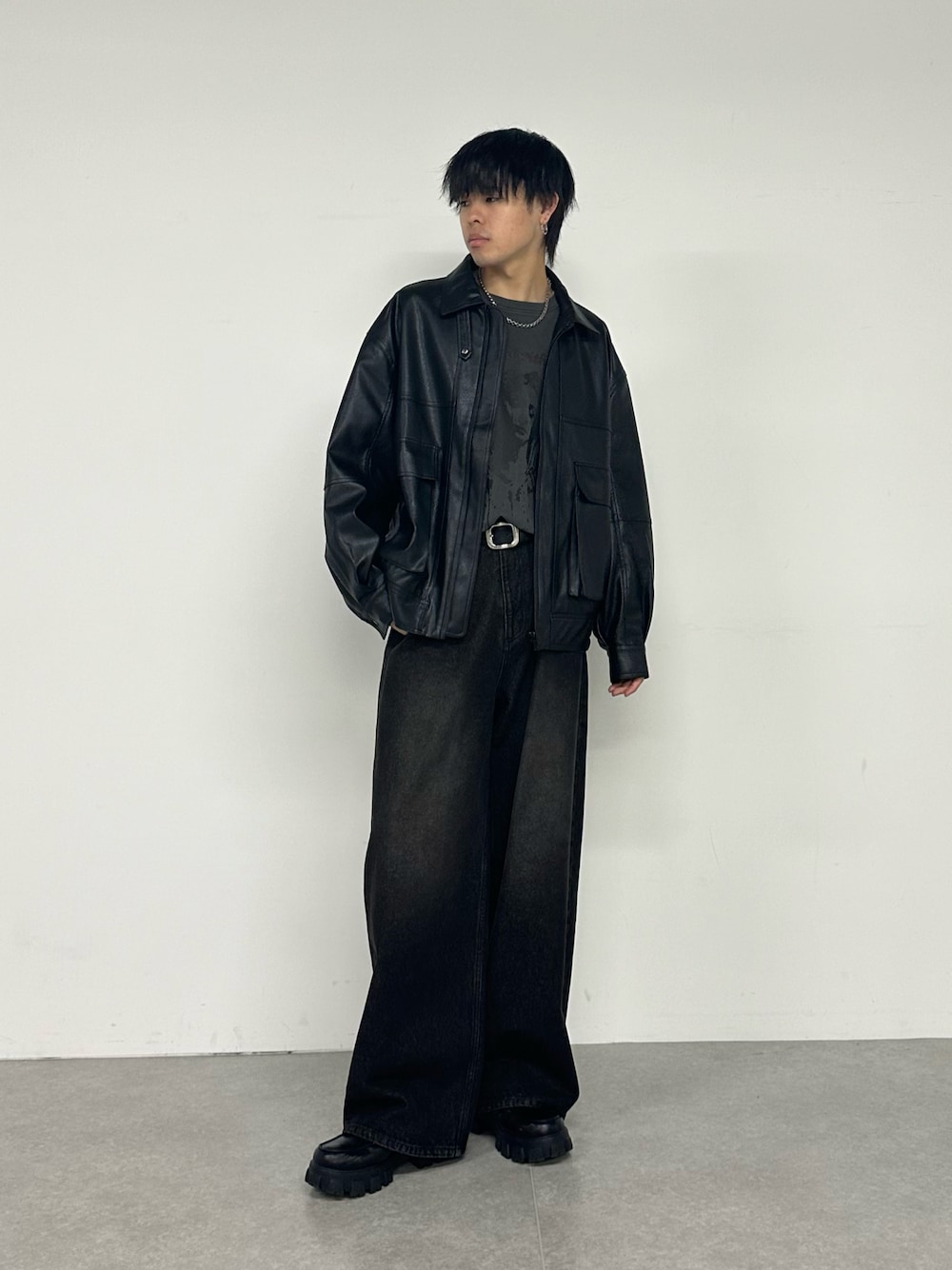 【アウター】着用サイズL 昨年人気だったレザーブルゾンが今年も登場!! ゆったりしたシルエットにスタンドネックになる2way仕様!! 【トップス】着用サイズL ピグメント加工で、さりげなく見えるプリントがかわいいビッグTです。 ゆとりのあるサイズ感で1枚でもゆったり着ていただけます。 【デニム】着用サイズL ワイドストレートデニムの昨年人気で復活したカラーのブラックです!! ヴィンテージ感があり韓国っぽコーデやストリートコーデにはもってこいのカラーです。