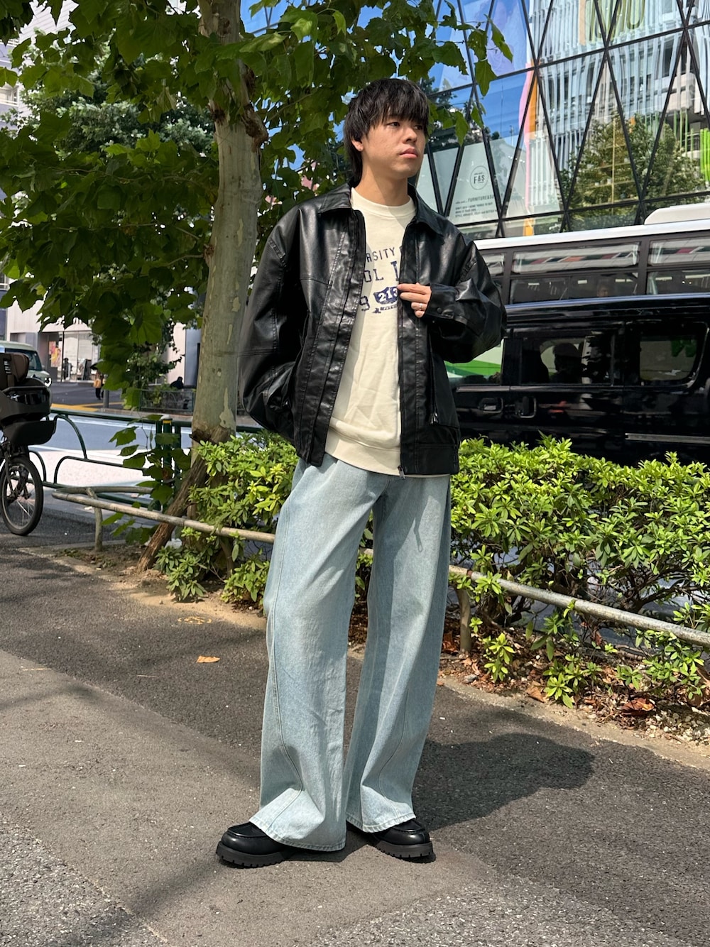 【アウター】着用サイズL 昨年も人気だったレザーブルゾン。 ゆったりとした身幅と腕周りで、ニットやスウェットの上からでもごわつかずに羽織れます。 袖口はボタンが2つあり調節可能可能で、裾はゴムでストレスフリーな着心地になってます。 スタンドネックにもなる2WAY仕様で、コーデや気温に合わせてスタイリングを変えられるのもこのアイテムの特徴です!! 何よりコスパ最強!!! 【ボトム】着用サイズL ゆったりとしたシルエットに加え、裾に向かって緩やかにカーブしたデザインが特徴のデニムです。 脚のラインを拾わずにスタイルアップが叶うデニムになってます。 10.5ozと厚すぎずオールシーズンで活躍するアイテムです