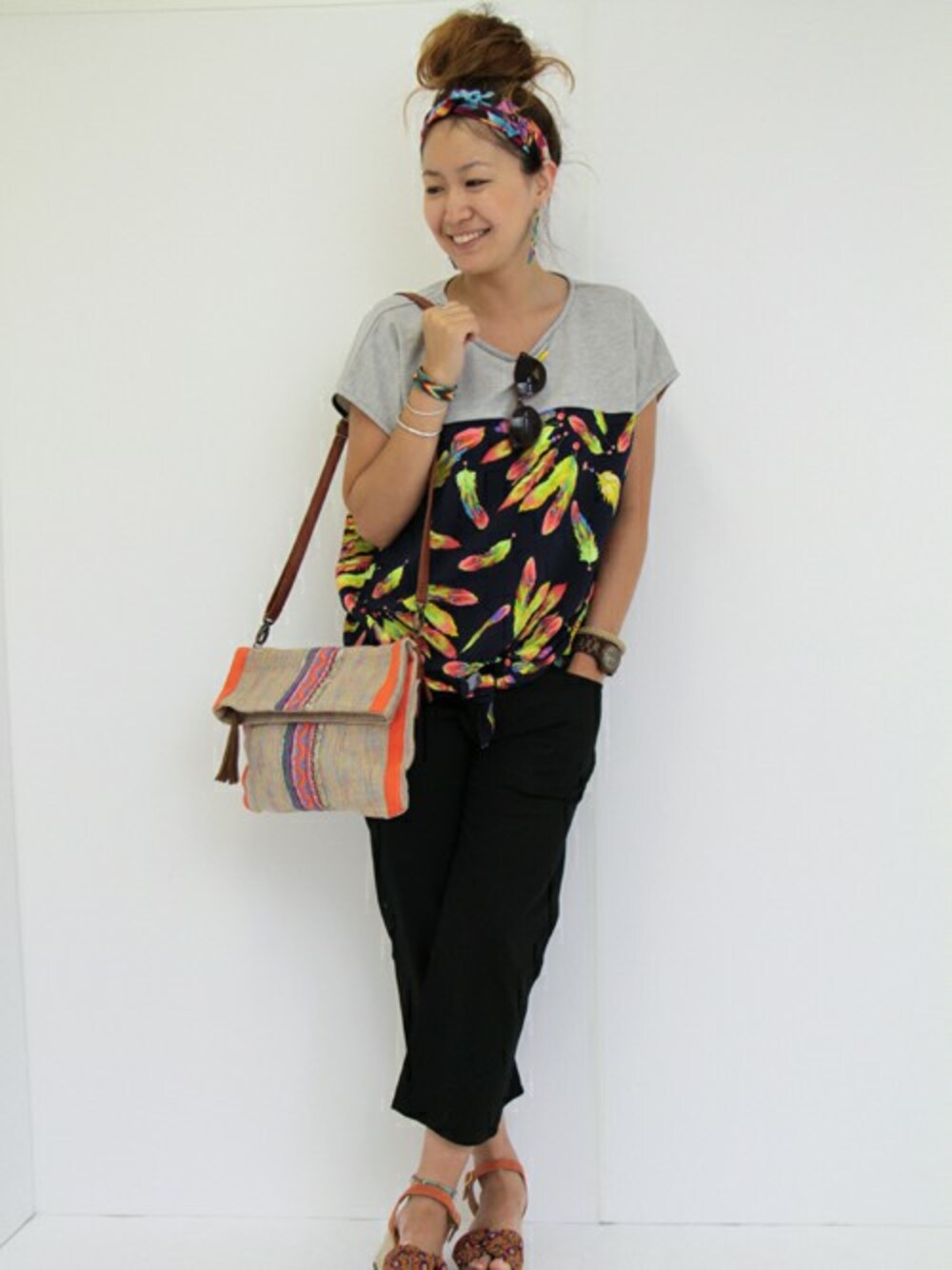 ネオンカラーがクールな雰囲気を感じるトップス。 ブラックのパンツに合わせてシックにまとめました。 オレンジのバッグが全体のアクセントに♪
